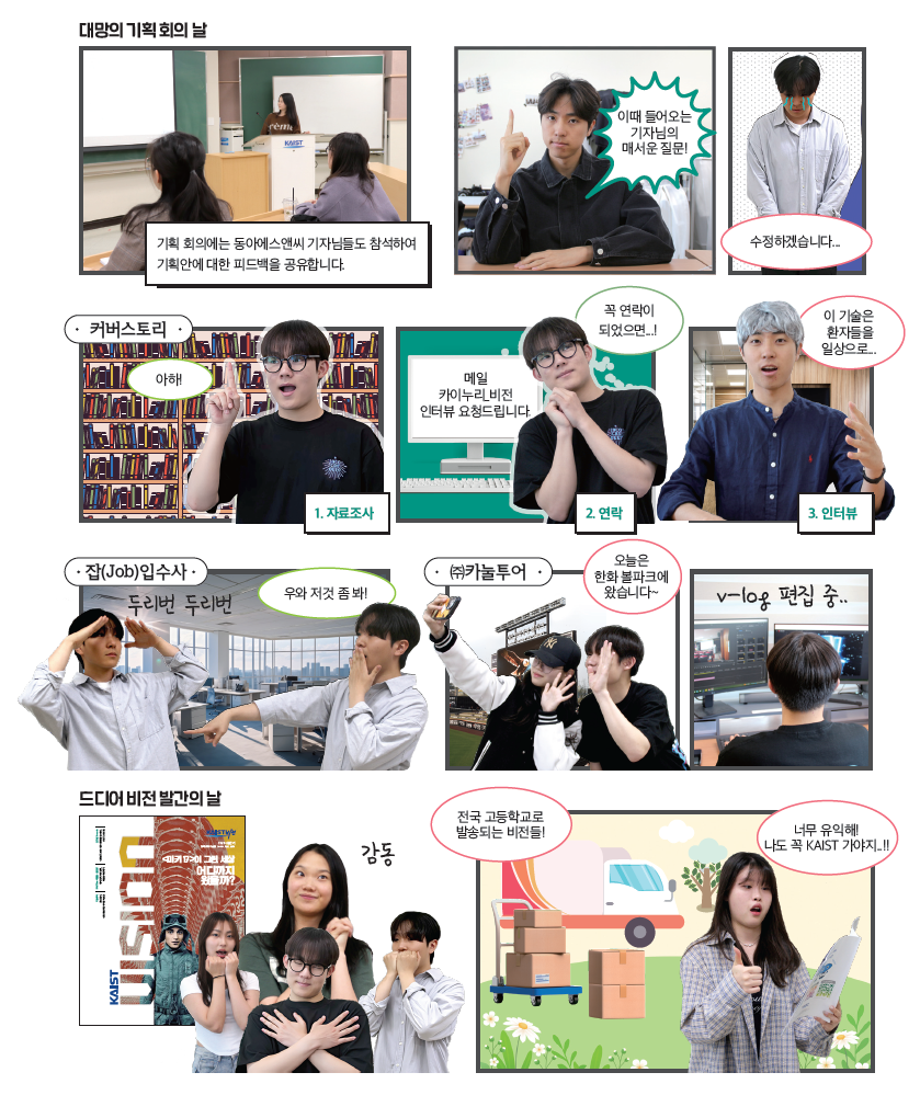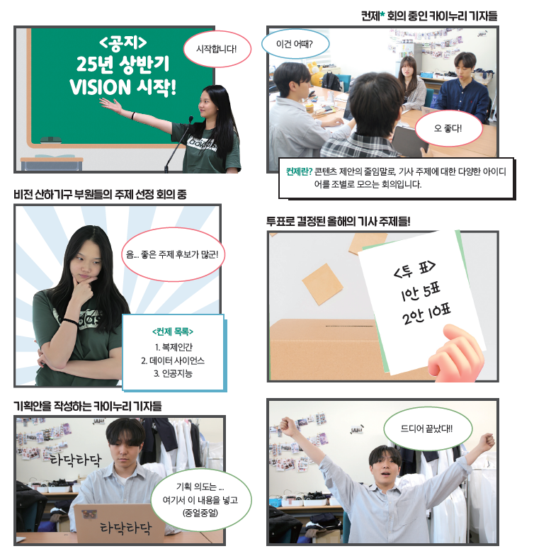 <KAIST비전>은 카이누리가 작성하는 KAIST 홍보 잡지로 전국의 영재학교, 과학고 학생들을 포함하여 많은 고등학생이 읽는다. 1년에 2회 발간되며 주제 선정부터 인터뷰, 영상 촬영, 기업 탐방, 그리고 기사 작성까지 카이누리 학생기자들이 직접 참여하고 있다. 콘텐츠 제안과 선정, 기획안 작성, 기획 회의, 초안 작성 및 교열 각각의 과정에서 어떤 일이 일어나는지 자세하게 알아보자!
